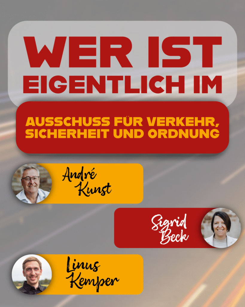 Der Ausschuss für Verkehr, Sicherheit und Ordnung der Gemeinde Herzebrock-Clarholz besteht aktuell aus 13 stimmberechtigten Mitgliedern. Drei davon vertreten die UWG. Der Ausschuss sorgt dafür, dass das tägliche Leben in der Gemeinde strukturiert, sicher und funktional abläuft.